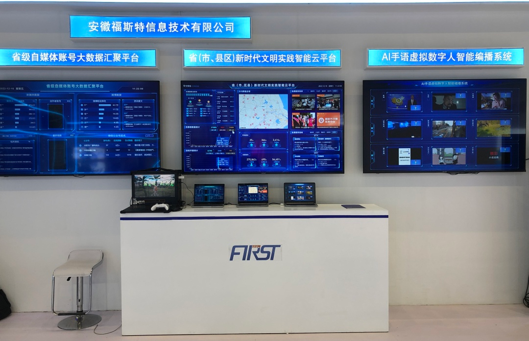 安徽福斯特信息技術有限公司此次應邀參展,以廣電媒體發(fā)展為亮點,集中展示大數據、人工智能呈現了AI-VLOG視頻智能合成系統+AI手語虛擬數字人智能編播系統+省級自媒體賬號大數據匯聚平臺+省(市、縣區)新時代文明實踐智能云平臺技術。